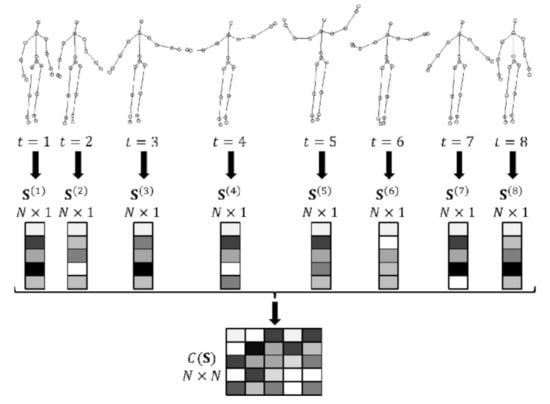 According to [], approaches to HAR using RGB-D information fall into two categories: feature-based and model-based. Feature-based techniques such as histogram of oriented gradients (HOG) and the subspace clustering-based approach (SCAR) are used to extract features for recognising human activity from data acquired using sensors. Ref. [] applied statistical covariance of 3D joints (Cov3DJ) as features, as shown in Figure 4, to encode the skeleton data of joint positions, which were then used as input to an SVM model for activity recognition. Another approach applied by [] used a sequence of joint trajectories and applied wavelets to encode each temporal sequence of joints into features used in activity classification. Model-based techniques have to do with the construction of a human model for recognition either as a 2D, 3D or skeletal model. Ref. [] constructed models using a kinematic approach that extract features from frame sequences for human structure representations. Ref. [] used a neural network technique to propose an end-to-end hierarchical recurrent neural network (RNN) for representing skeleton-based construction. They made use of the raw positions of human joints as input to the RNN. A combination of both feature-based and model-based approaches for the classification of activities was shown in []. The authors used a maximum entropy Markov model (MEMM) for the classification of activities using features from skeleton tracking combined HOG.