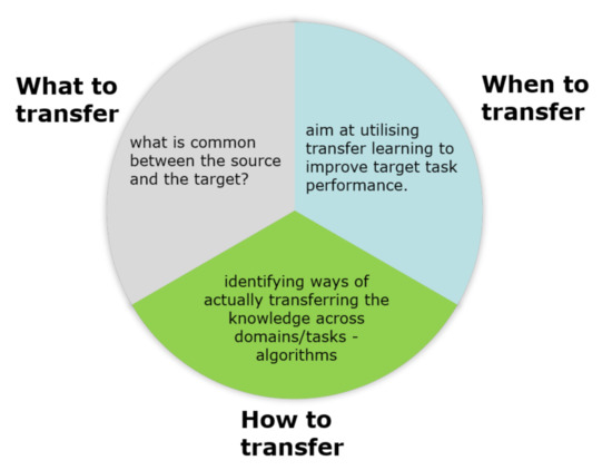 TL has recently attracted interest in recent years, due to the potential benefits it offers in artificial intelligence applications, including assisted living [], computer vision [] and robotics []. It has not recorded as much success as the long existing traditional machine learning (ML) methods, partly due to the challenges which yet remain unresolved in the research community [], although it has the potential to become a fundamental driver for the success of ML in the coming years. The challenges facing TL implementations, as shown in Figure 7, depend on defining the metrics associated with the following aspects: what to transfer, how to transfer and when to transfer. Providing solutions to address these three aspects has been the focus of many researches, thereby motivating proposals of different TL algorithms.