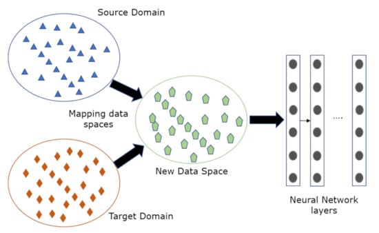 Mapping of data spaces in DTL. The source and target domains are mapped and the new data space used as input to a deep neural network.