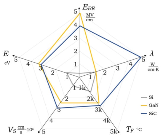 The main characteristics of WBG devices have been represented in Figure 1, compared to those of Si. This plot depicts physical parameters such as the thermal conductivity, λ, the melting point, TF, the breakdown electric field, EBR, the bandgap energy, E, and the electron saturation speed, Vs. It can be seen how WBG performance stands out as compared to Si-based power devices in the magnitudes related to operating temperature (λ and TF), to voltage ratings (EBR) and to switching frequency and losses (E, VS).