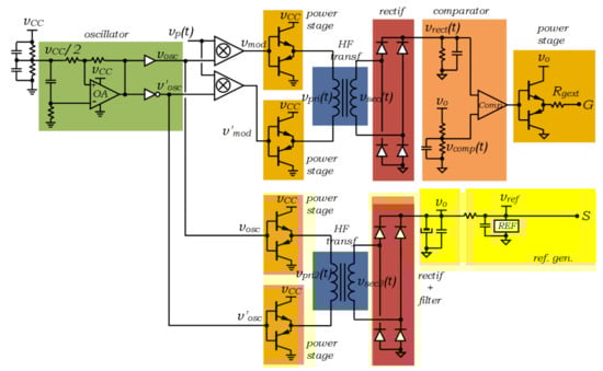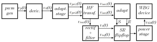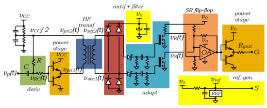 By observing Figure 5, it can be seen how the secondary side signals vsec1 and vsec2 can be processed to trigger the turn-on and turn-off instants. The followed strategy is to generate, from these waveforms, set (vS) and a reset (vR) input signals for an RS flip-flop, that reconstructs the original gating signal. This block has been implemented by means of an operational amplifier (OA). A final power stage is in charge of shaping the digital gating signal to the final output values, and also to inject the required power by amplifying the output drive current.
