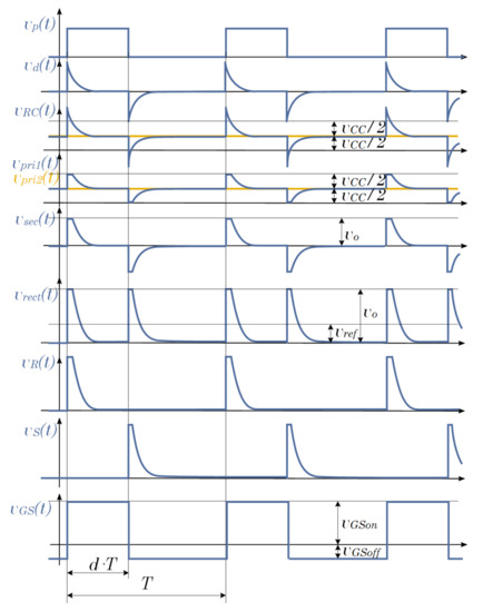 The supply voltage at the secondary side, vo, is obtained by rectifying and filtering the secondary side voltage, vsec. This value is ensured with the turns-ratio obtained from (6). The adequate supply of the power MOSFET implies a non-symmetric voltage drive, given by vGSon and vGSoff. In order to attain the adequate negative bias in the output voltage pulses, a voltage reference integrated circuit is needed which ensures a stable negative vGSoff voltage level.