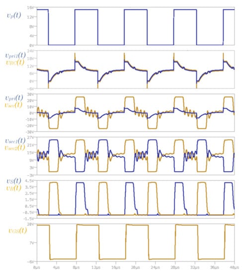A set of simulations has been carried out to further design the rest of elements in the driver. Figure 7 shows the simulated waveforms for a 50% duty ratio pulse signal, switching at 100 kHz. It can be seen how the derived waveform is measured at the primary side of the transformer, and how the pulsed waveform is transferred to the secondary side. The terminals at the secondary side also provide the set and reset signals for the analog edge-triggered flip-flop. The final voltage at the gate of the SiC Power MOSFET reaches the target values of +20 V/−5 V.