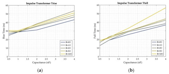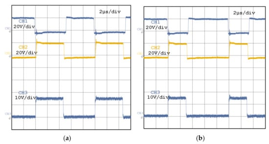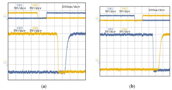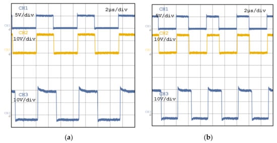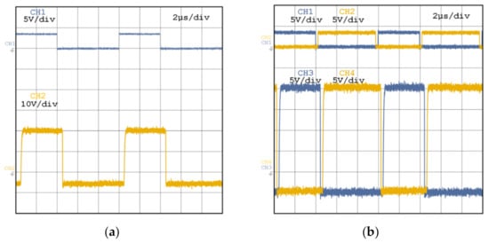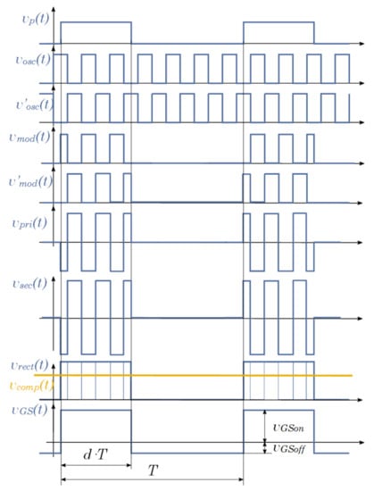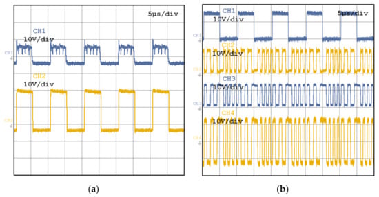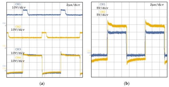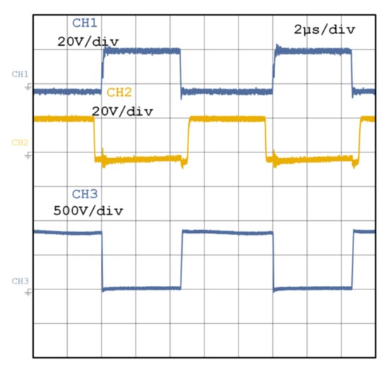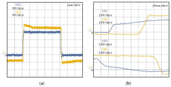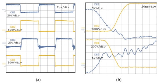 - Transient features of the power device, such as the turn-on, ton, and turn-off, toff, switching intervals, as well as the rise and fall time intervals, tr and tf, respectively, which are much faster than in the case of standard drivers for Si devices. Additionally, the propagation delays with increased switching frequency need to be considered in SiC-based power converters []. As a main requirement, the gate voltage of the SiC MOSFET must have a fast dv/dt to achieve fast switching times. This indicates that a very low impedance driver is necessary [,]. For instance, if an optocoupler is used, it must provide a high common mode transient immunity (CMTI) [].