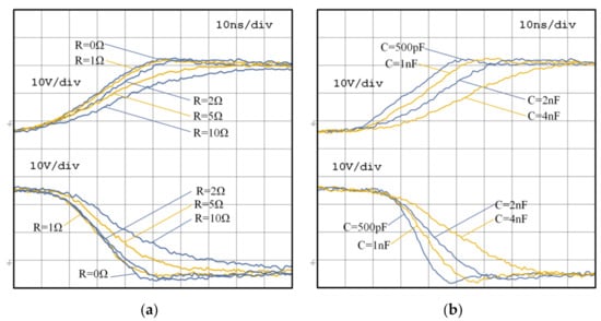 This parameter must therefore be considered in the circuit design []. Generally speaking, the smaller the RG, the faster the switching. In fact, RG reaches a minimum value by making RGint = 0. However, this provides EMI issues and stresses the gate much more []. On the other hand, the larger the RG, the smaller the peak driver current, consequently limiting the switching speed. It also can be stated that the larger the RG, the smaller the ringing voltage at vGS [,,,,].