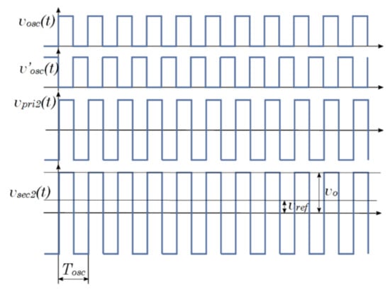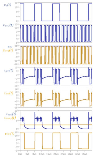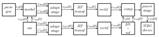 Even assuming an adequate matching of impedances and a sufficient power level, if such a signal vp is directly applied to the primary side of the transformer, taking into account that vp inherently includes a DC component, it is obvious that the transformer operating conditions will eventually become saturated, yielding a malfunction of the system. In order to avoid the saturation of the core, the proposal opts to provide a processed signal from the original waveform, by means of a derivative block that generates the pulsed waveform vd. As it can be seen in Figure 5, the pulsed signal has a null average voltage value. This ensures an operation free of saturation in the transformer, independently of the duty ratio of the signal considered. However, the gating PWM signal needs to be reconstructed in the secondary side, by ensuring the required voltage values and the adequate power levels. In order to achieve this, the derived signal is adapted to enter the primary and secondary sides, by boosting its power levels by using an adapting stage. This stage generates the voltage signals at the primary side of the transformer, vpri1 and vpri2, with adequate voltage and power levels. The secondary side terminals are connected to a stage that rectifies and filters the secondary waveforms, vsec1 and vsec2, to generate the secondary side supply voltage, vO. This stage also generates a reference voltage, vref, that will provide the final asymmetrical vGSon and vGSoff levels.