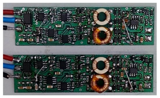 However, the simulation only provides a partial validation of the operation of the driver. Aspects such as the full model of the transformer or details in the functional limitations of the circuit can only be assessed by constructing a laboratory prototype of the driver. Figure 8 shows the actual prototype of the driver. The initial design of the impulse driver presents a layout area of 82 × 19 mm2. The transformer has been implemented in a toroidal core, and the primary (left) and secondary (right) sides of the driver can be clearly identified. The design of the magnetic element has been carried out from the design constraints in expressions, and also following the procedures and the Design Tool SFDT given by the manufacture of the toroidal core, FerroxcubeTM []. Two devices were built, in order to test the operation of the driver in a bidirectional DC-DC buck-boost converter (see the main characteristics given in Table 4). This converter is implemented using C2M0080120D SiC Power MOSFET, from Wolfspeed (VDS = 1200 V, ID@25C = 36 A, RDSon = 80 mΩ, QG = 62 nC, GGS = 950 pF, GGD = 7.6 pF).