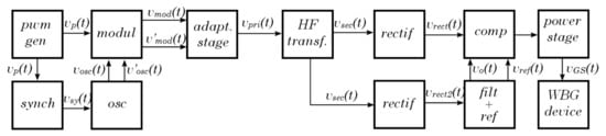 - Garcia, J.; Gurpinar, E.; Castellazzi, A. Impulse transformer based secondary-side self-powered gate-driver for wide-range PWM operation of SiC power MOSFETs. In Proceedings of the 2016 IEEE 4th Workshop on Wide Bandgap Power Devices and Applications (WiPDA), Fayetteville, AR, USA, 7–9 November 2016; pp. 59–63. [Google Scholar] [CrossRef]