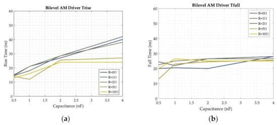 - The parasitic capacitances of the power device. Some complexity is imposed by the turn-on and off events due to several nonlinear parasitic capacitances that affect the process. These capacitances depend on the operating conditions of the device. Moreover, these values are coupled with the conditions at the gate drive []. Therefore, the study of the switching waveforms in SiC is critical for understanding the requirements for the gate driver, particularly for very fast drivers []. However, the measurement and characterization of these components, specifically the SiC MOSFET capacitances, is not straightforward in most cases [,,].