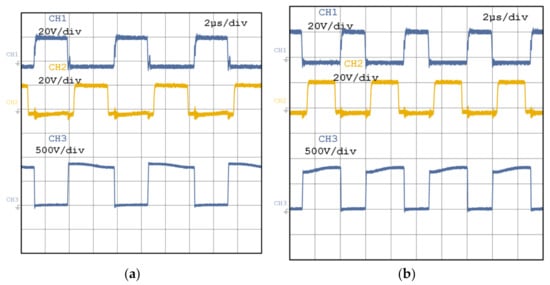 The values of the parasitic capacitances of the device, CGS, CGD and CDS, must be considered. In some configurations, the high switching speed can trigger resonances formed by the parasitic capacitances along with the parasitic elements of the circuit []. This can lead to modulating the gate voltages and potentially triggering undesired switching of the device []. The gate resonant circuit is formed by the SiC MOSFET input capacitance, the gate wiring inductance (gate and source inductance), and the gate resistance (external gate resistance, intrinsic MOSFET gate resistance and intrinsic gate driver resistance) [].