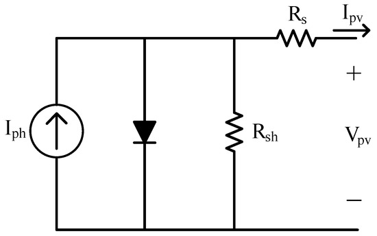 Figure 1 shows the equivalent circuit of the SDM consisting of a photovoltaic current source, a diode, and resistances [,]. The electrical behavior of a PV module is illustrated by its voltage-current (V-I) curve with the photovoltaic current and the Shockley diode equation.