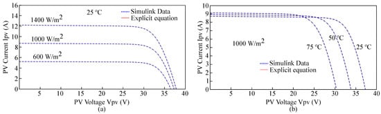 The I-V curve can be obtained by using (5). Figure 2 shows the I-V characteristic of a solar array and the accuracy of explicit Equation (5) compared with the electrical Simulink data. Figure 2a are static characteristics when a specific solar array encounters different irradiance levels (600, 1000 and 1400 W/m). Figure 2b illustrates the I-V curves at different ambient temperatures (25, 50 and 75 °C) with the same irradiance 1000 W/m. As it can be seen in Figure 2, variations of irradiance affect the short-circuit current of a solar panel significantly, while the open-circuit voltage mainly depends on the temperature level. It also can be observed in Figure 2 that Equation (5) can represent the I-V curve almost perfectly.