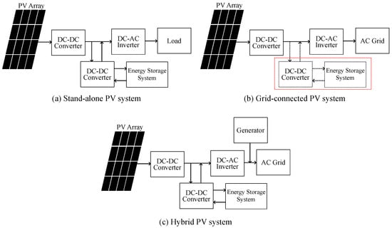 In general, power systems with PV panels can be divided into three types, standalone PV systems, grid-connected PV systems, and hybrid PV systems []. Figure 3a shows the configuration of a stand-alone PV power system consisting of a PV array, two DC/DC converters, a DC/AC inverter, and an energy storage system. The energy storage system supplies the power to the load when the sunlight is insufficient and is charged when the generated power is higher than the load requirement. Figure 3b illustrates the diagram of a grid-connected power system, which can be subdivided into two systems, decentralized grid-connected PV systems, and central grid-connected PV systems. PV array is connected with DC/DC converters and a DC/AC inverter to fulfill the grid power requirement and execute the MPPT algorithm and the power curtailment method. Energy storage systems can also be attached to the grid-connected power system as a backup power supply. Figure 3c depicts a hybrid PV power system. Additional generators are connected to the AC grid for satisfying the grid power demand.