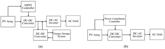 Alternative PV system controls: (a) with energy storage system, and (b) with power curtailment control algorithm.