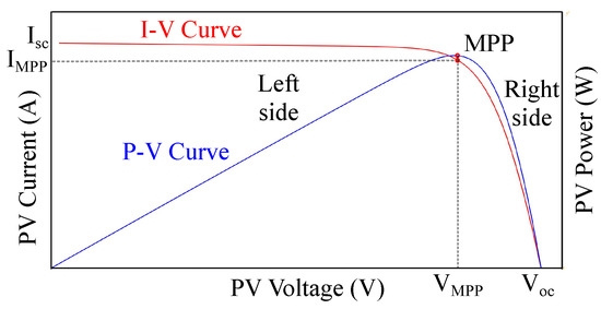 In a PV system, the PV array can be operated on the left side or the right side of the MPP, as shown in Figure 5. The left side is located at the left part of the MPP. On the contrary, the right side is allocated on the right part of the MPP. Both sides have advantages and drawbacks []. When operating on the left side of the P-V curve, the PV system can be operated at a wider power range, while the power efficiency of the PV system is higher if operating on the right side.