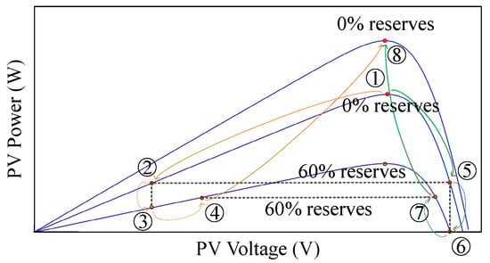 Figure 6 illustrates variations of operating points on both sides of the MPP when the PV power reserves. Before operating on the curtailed mode, the operating point is located at the MPP, denoted by point 1. If weather conditions are constant and the PV system executes the 60% reserve command, there exist two selections of the operating points: point 2 and point 5. When operating on the left side of the MPP, the available PV power drops directly from point 2 to stable point 3 if the irradiance level decreases suddenly, and it then increases to operating point 4 at the 60% reserve command. During this short period, a spike caused by the irradiance change happens. A subsequent increase of irradiance level, if the power reserve command is reduced to zero, will move the operating point to point 8 for satisfying the power demand. Similarly, the operating point falls rapidly on the right side when the irradiance level decreases. In some cases, such as from point 5 to point 6, the operating point may drop to zero, meaning that the PV system does not generate any energy. This is because the open-circuit voltage of the PV array highly depends on the temperature.