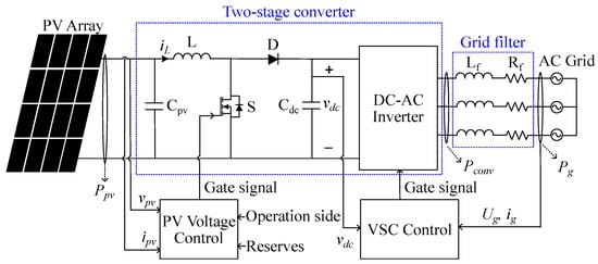 Figure 7 shows the topology of a grid-connected PV system with a two-stage converter and a grid filter. Boost converter in the two-stage converter is used to boost the output voltage of the PV array, following with DC/AC inverter that transforms the DC current/voltage into AC, connecting the PV array to the AC grid. The PV voltage control system implements the PV power curtailment method and maximum power point tracking of grid power (ACMPPT) to satisfy the AC grid requirement. In contrast, a voltage source converter (VSC) control algorithm is applied to maintain the DC link voltage and the unity power factor (PF).