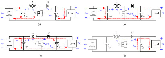 The bulky capacitor , installed between the PV array and the boost converter, is used for ripple mitigation. The DC link voltage is held constant by regulating the power flow of the DC link capacitor . For high-frequency switching, a MOSFET can be adopted. The operation of the boost converter can be specified into four modes, depending on the current flowing and the switch operation.