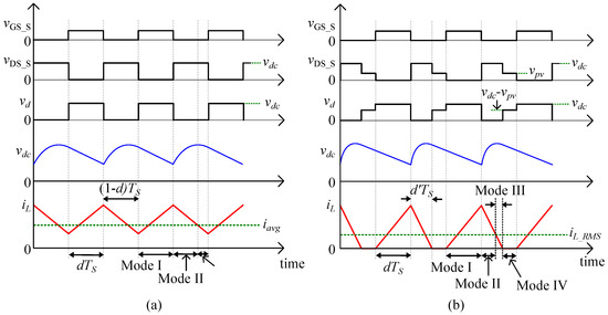 In practice, the boost converter in PV systems may be operated at either the continuous conduction mode (CCM) or the discontinuous conduction mode (DCM), depending on the designed circuit parameters and operating conditions. Theoretical waveforms at CCM and DCM operations of boost converter are shown in Figure 9a,b, respectively. The designed circuit parameters are assumed to be ideal during operation, and the PV array regards as a DC source. The duty ratio d is the ratio of the duration of the increase of the inductor current, (red line), to the total period . For operating at CCM, is operated above zero. For DCM, decreases to zero and represents the ratio of the time is which decreases to zero to .