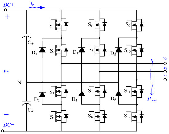 Figure 10 shows the topology of a three-phase three-level bridge inverter. Each AC output connects to DC+, DC−, and the neutral point N, which is the center point of the DC link. The DC voltage/current transforms to AC by regulating the duty ratio of switches in the three-level bridge inverter. Table 2 lists switch states of the diode-clamped three-level bridge inverter. The output voltage is when switches and are turned on, while is when and are switched on. In N state, is kept at 0 V with turned on switches, and .