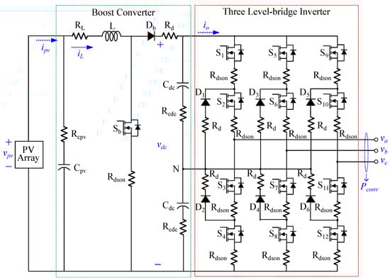 A PV system is equipped with a power electronic converter to transform the sun’s radiation into electricity. The components in the converter, such as switches, inductors, and capacitors, cause power losses in the PV system, leading to a mismatch between the PV power and the grid one []. Figure 11 shows the topology of the two-stage converter with equivalent series resistances (ESR).