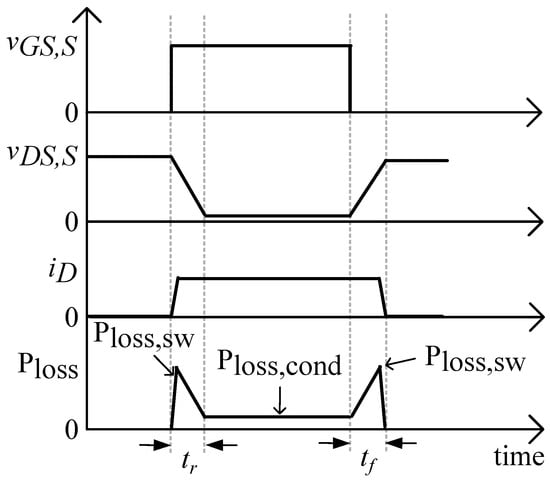 In general, losses produced by power switches can be divided into static losses, including the conduction and cut-off losses, and dynamic losses, including the turn-on and turn-off losses. To simplify the analysis, the essential losses, the conduction and switching losses, are estimated, which are shown in Figure 12 and can be expressed by: