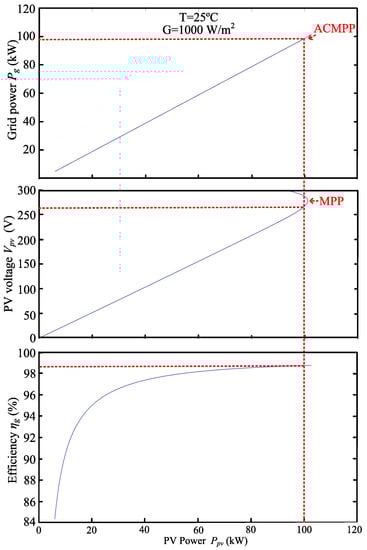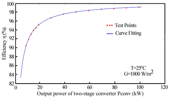 All of the above mentioned methods estimate the maximum available power point and/or the entire P-V curve. However, none of them consider the power losses that occur in electronic converters. This is a fundamental issue, as a PV array is commonly equipped with a DC/DC converter and a DC/AC inverter: the former is used to implement the maximum power point tracking (MPPT) algorithm [,] and the latter serves to inject the electric energy into the AC grid. Power losses of components in those converters/inverters cause a mismatch between the actual AC power and the PV one. Thus, power losses cannot be ignored when a PV system is operated on the curtailed mode. This paper proposes a novel PV power curtailment strategy that takes into account the power losses in the electronic devices through their efficiency curve, calculated by nonlinear least-squares curve-fitting with variations of temperature and irradiance. The accuracy of the actual efficiency curve compared with test points is verified, and a control scenario with the power curtailment method is programmed in simulation.