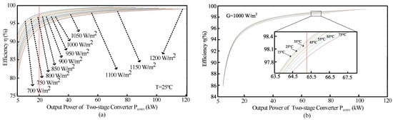- The two-stage converter efficiency is mainly affected by the irradiance levels when the PV power system operates on the left side of the MPP. On the contrary, the temperature levels influence the converter efficiency significantly when working on the right side of the P-V curve.
