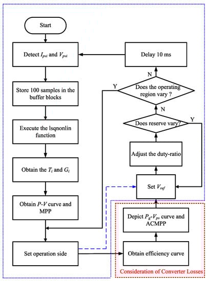 The block diagram of the power curtailment method proposed is shown in Figure 17. The power curtailment method [], which is marked a blue line, is improved with the consideration of converter losses, which is marked by the red dashed line in this control scheme. The PV current, , and the PV voltage, , are detected for implementing the lsqnonlin function. Once nonlinear least-squares curve-fitting problems are solved, the achieved temperature, and irradiance, are obtained. Then, the actual P-V and I-V curves can be depicted, and the MPP is identified by using the IV equation of the SDM with Lambert W function expressed in Equation (5).
