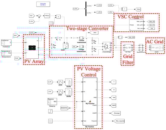 A model for a 100 kW grid-connected PV system with a two-stage converter is set up in Simulink, adapted from [], as shown in Figure 18, to verify the effectiveness of the control strategy presented in the previous section. The resistances attached to the components of the two-stage converter and the grid filter simulate the losses of the power system. The PV voltage control system cooperates with the VSC controller to implement the control scheme. The designed circuit parameters of the two-stage converter and the AC grid are shown in Table 3 and Table 6, respectively.