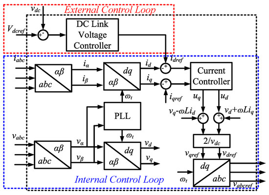 The VSC control system continuously receives grid currents, grid voltages, and the DC link voltage from the measurement blocks, as shown in Figure 19. These instantaneous current and voltage measurements are transformed through abc to Alpha-Beta-Zero blocks, Alpha-Beta-Zero to dq0 blocks, and PID controller for implementing two VSC control system control loops: external and internal control loops. The outer control loop maintains the 500V DC link voltage while the inner control loop regulates and grid currents to keep the unity power factor. current reference from the DC link voltage controller is used for the regulation of the active power. current reference is set to zero to eliminate the reactive power flowing to the grid. As a result, three modulating signals are obtained to generate the PWM signal that controls DC/AC converter.
