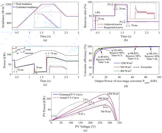 Simulation results: (a) Irradiance evolution, (b) power reserves evolution, (c) power evolution, (d) two-stage converter efficiency, and (e) estimated and actual P-V curve.