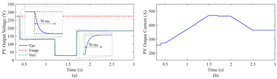 PV array outputs: (a) PV output voltage evolution, and (b) PV output current evolution.