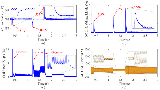 Figure 22 shows the results of the grid side of the PV system. In steady-state, the DC link voltage ripple is lower than 0.3%, as shown in Figure 22a,b. The worst case, with the DC link voltage (527 V) happens when the reserve command changes suddenly at 1.7 s. During this period, the DC link voltage ripple is 5.5%. Figure 22c illustrates the grid power ripple. The fluctuation of the grid power is affected by the irradiance and the reserve levels. Compared with the 90% reserve level from 1.5 s to 1.7 s, the grid power ripple at the 30% reserve level from 1.7 s to 2.0 s can be negligible. During 0.5–1.5 s and 2.0–2.5 s, the irradiance level varies continuously, causing variations of the grid power ripple value. The line grid currents are depicted in Figure 22d.