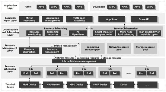 The overall architecture of the TSCFN is shown in Figure 1, which mainly includes the resource scheduling layer, the resource management layer, the orchestration and scheduling layer, the capability open layer, and the application layer. The resource scheduling layer unifies and manages resource instances in heterogeneous devices with different configurations and different operating systems using container virtualization technologies. TSCFN relies on the resource scheduling layer to sense the network resources, computing resources, and storage resources in the cluster. The resource scheduling layer is the basic form of orchestration and scheduling of fragmented terminal resources—it reports the resources information to the resource management layer. The resource management layer abstracts, maps, and manages the unified fragmented device resources to form the terminal-side computing resource pools and storage resource pools, which shield the underlying differences of the devices. The resource scheduling layer and the resource management layer jointly realize the unified management of device resources of TSCFN. The orchestration and scheduling layer is the brain in TSCFN. It intelligently decomposes applications and reasonably arranges and schedules computing tasks with AI algorithms according to the TSCFN load, node availability, and attributes of upper-layer applications. The capability open layer provides a unified capability set of computing capabilities, storage capabilities, and AI capabilities of TSCFN, and provides standard open APIs for the different application environments. Developers only need to package applications into containerized micro-services, which can be easily deployed, updated, and iterated on TSCFN. At the same time, TSCFN also built an application store for developers and users, which can provide better integrated computing services and enrich the ecology of TSCFN.