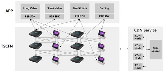 CDN (Content Delivery Network) is a distributed technology that distributes the content of the source site to all nodes, thereby shortening the delay for users to view content and improving the response speed of user access. It can effectively solve the problems of small network bandwidth, large number of user visits, and uneven distribution of network points. Currently, it is mainly used in video acceleration. With the increasing demand of users for high-definition video, live broadcast, etc., the CDN market is developing rapidly. The current total market size is about 300 T–500 T, which has reached CNY 31.1 billion in 2020 and is expected to reach CNY 95 billion in 2025. Based on TSCFN, idle traffic bandwidth capabilities of massive video boxes, smart speakers, and other lightweight devices can be integrated, and provide users low-cost CDN to enhance the service experience, including OTA upgrades, long and short videos, live broadcasts, game acceleration, etc. Figure 4 presents an overview of Home CDN services based on TSCFN.