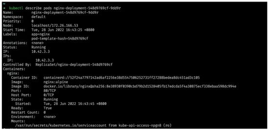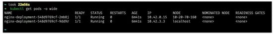 Firstly, in order to verify the Android-based container scheduling scheme, an Android mobile phone (CPU MT7661, 4 GB + 64 GB memory) was selected to build a test environment. Firstly, we start the container in the test phone, and deploy and run the NGINX service in the container. The test results feedback that the container in the Android device can run successfully, and K3s can manage and schedule the container. Figure 7 and Figure 8 show the operation of K3s Server and Agent.