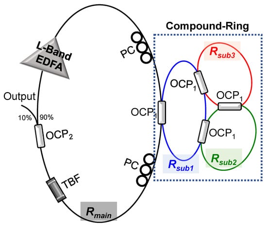 As seen in Figure 1, the OCP2 of the presented EDF laser can be circled to construct a main ring (Rmain). Four OCP1s are exploited to generate the compound-ring configuration, which causes three sub-rings of Rsub1, Rsub2 and Rsub3, respectively. Actually, each ring produces its equivalent free spectrum range (FSR), which is stated by the expression FSR = c/(n⋅L), where c, n and L are the speed of light in vacuum (c = 3 × 108 m/s), average index of fiber (n = 1.468) and fiber length, respectively. In the demonstration, four different fiber rings can be set in the presented EDF laser architecture to produce an effective and wide FSReff in line with the Vernier effect to create the mode-filter function []. Then, the multi-longitudinal-mode (MLM) induced by the main ring can be suppressed according to the wide FSReff based mode-filter. Here, the measured fiber lengths of Rmain, Rsub1, Rsub2 and Rsub3 are 31, 8, 5 and 4 m, respectively. Therefore, the calculated FSRmain, FSRsub1, FSRsub2 and FSRsub3 are 6.59, 25.54, 40.87 and 51.09 MHz, respectively. Then, the FSReff of 53.33 GHz will be achieved when the compound-ring of FSRsub1, FSRsub2 and FSRsub3 reaches the least common multiple. As mentioned above, the achieved FSReff of the compound-ring scheme is larger than the 3 dB bandwidth (50 GHz) of the TBF. Thus, the applied compound-ring can guarantee the SLM operation in the EDF laser.