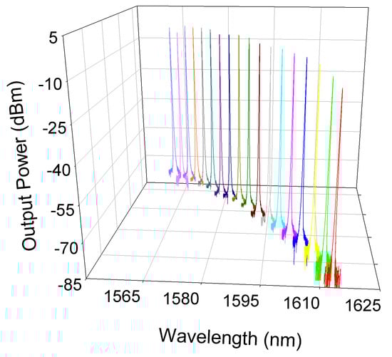 To comprehend the optical output characteristic of the proposed compound-ring EDF laser, Figure 2 displays the observed spectrum of each lasing wavelength in the wavelength-swept bandwidth from 1563 to 1613 nm, while the TBF is adapted appropriately. The measured wavelength also shows better optical signal to noise ratio (OSNR) output. As seen in Figure 2, due to the designed compound-ring structure, the optical background noise can be blocked fully to achieve higher OSNR output. Here, Figure 3 presents the detected output powers and OSNRs of the fiber laser under the different tuning wavelengths. The detected output power and OSNR ranges of the EDF ring laser are in the scales of −10.8 to 0 dBm and 64.5 to 74.4 dB, respectively. The greatest output power and OSNR are observed at the wavelengths of 1578.0 and 1599.0 nm, respectively. In addition, the OSNR of >70.4 dB can be achieved in the tuning scope of 1563 to 1608 nm. As the generated wavelength travels to the longer wavelengths, the found output power and OSNR slowly decrease, as seen in Figure 3. Since the commercial EDFA already has an optical isolator inside, the directionality of lightwave transmission is limited. Thus, the damage behavior can be avoided in the proposed EDF laser.