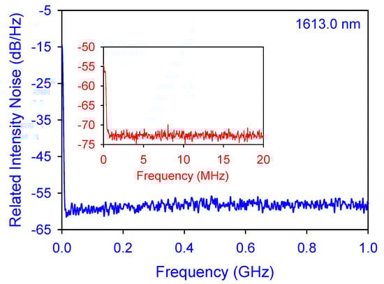 Then, to check that the obtained wavelength of the compound-ring EDF laser has the SLM oscillation, the delayed self-homodyne process was constructed for the demonstration []. Thus, the Mach–Zehnder interferometer (MZI), which is composed of a PC, two 1 × 2 and 50:50 OCPs, and a length of 50 km fiber, was applied in the experiment. One arm of the MZI was connected to a PC, and the other was linked to the 50 km fiber as the delay line. Here, an output wavelength of 1613.0 nm was selected initially in the setup for SLM observation. The 1613.0 nm beat wavelength entered a photodiode (PD) for changing to an electrical signal and was measured through an electrical spectrum analyzer (ESA, Agilent, E4403B). Figure 4 indicates the obtained electrical spectrum of relative intensity noise (RIN) over the frequencies from 0 to 1 GHz. We observe that no MLM oscillations can be measured for SLM output when the compound-ring induced mode-filter effect is exploited, as shown in Figure 4. Moreover, when we narrowed the spectrum observation range from 0 to 20 MHz, the received RF spectrum was still maintained at the SLM status, as displayed in the inset of Figure 4.