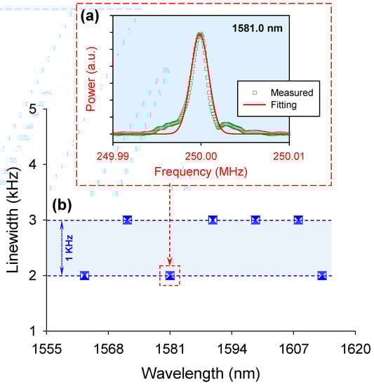 Afterward, a self-heterodyne detection can be used to measure the wavelength linewidth via the same MZI configuration []. Here, we used an optical modulator in the MZI setup to produce a 250 MHz frequency shift for the beating signal. An output wavelength of 1581.0 nm was chosen for detection initially. The observed spectrum of frequency linewidth at 1581.0 nm wavelength is seen in the green square symbol of Figure 5a over the frequency bandwidth of 249.99 to 250.01 MHz with 1 kHz resolution bandwidth. To determine the actual linewidth of 1581.0 nm wavelength, the Lorentzian function can be applied for fitting, as seen in the red line of Figure 5a. Here, the 3 dB Lorentzian linewidth of 1581.0 nm wavelength is about 2 kHz. We measured the 3 dB Lorentzian linewidth of output wavelength with 9 nm tuning interval in the tunable scope of 1563.0 nm to 1613.0 nm, as illustrated in Figure 5b. The obtained wavelength linewidth of the EDF compound-ring laser is between 2 and 3 kHz in the entire tunability range. The observed linewidth variation is 1 kHz over the whole tunable-wavelength scale.