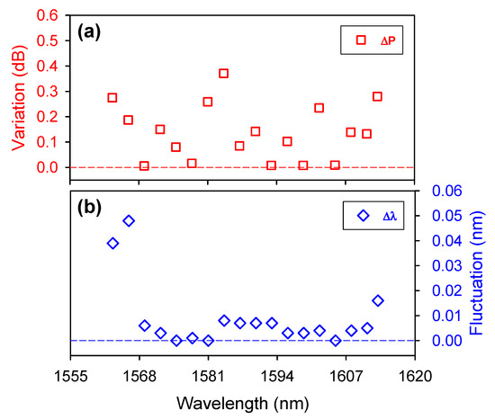 Finally, to further examine the actual stability of the EDF ring laser, the differences in the center wavelength and the output power were measured by the OSA and power meter. In the experiment, we selected eighteen wavelengths in the scale from 1563.0 to 1613.0 nm with even wavelength spacing for stability observation. The largest output power and center wavelength oscillations of the laser were obtained between 0.01 and 0.37 dB and 0 and 0.048 nm after an observing time of 40 min, respectively, as shown in Figure 6a,b. The 0.37 dB power variation and 0.048 nm wavelength change are at the generated wavelengths of 1584.0 nm and 1566.0 nm, respectively. Consequently, the demonstrated simple compound-ring can not only suppress the MLM noise and narrow the linewidth, but also can reach high OSNR and stable output performances.