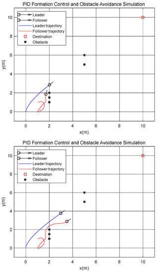 For the convenience of observation, the following point is set at 1 m to the right of the leader, and the simulation results are obtained in combination with the DWA (Dynamic-Window Approach) [32] local obstacle avoidance algorithm, as shown in Figure 6. It indicates that the two vehicles can form a stable formation when there is no obstacle, avoid obstacles separately when they exist on the predicted trajectory and finally reach the destination in the form of formation.