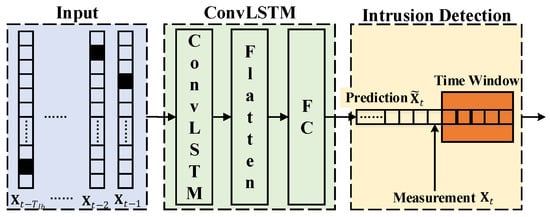 The output of the ConvLSTM neural network is an L-length softmax vector. Hence, for intrusion detection, it is converted to an L-length binary vector first. In , only the bit of with the highest probability is set to 1. The error between the predicted and measured vectors is