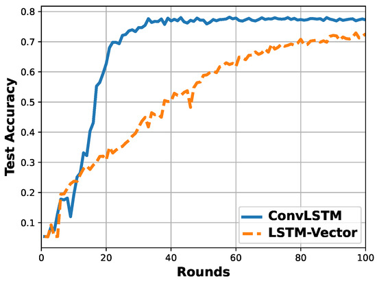Comparison of test accuracy per round between LSTM-Vector and ConvLSTM.