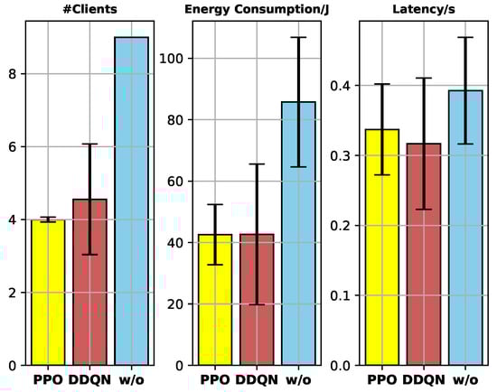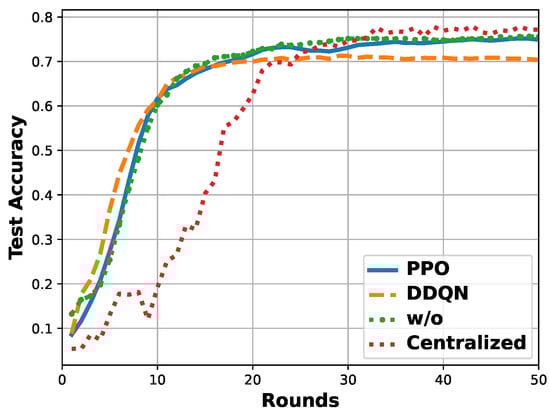 The proposed PPO-based FCS scheme is evaluated here, and the DDQN-based FCS [] and fundamental FL without FCS are used as benchmarks. For the case of fundamental FL, all the clients in Figure 4 are selected.