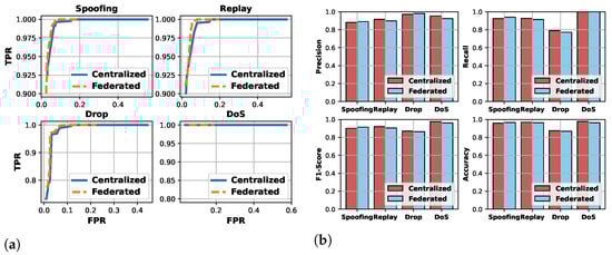 Comparison of network intrusion detection between centralized and federated ConvLSTM-based methods: (a) ROC curve, (b) precision, recall, F1-score, and accuracy.