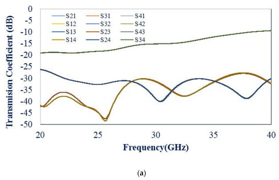 The simulated reflection coefficient is shown in Figure 9. It shows a passband response from 26 GHz to 40 GHz. Transmission coefficient values between all the ports are depicted in Figure 10. The achieved isolation amongst all the ports is better than 24 dB.