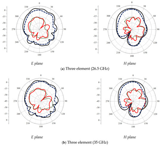 Figure 16 shows the radiation measurement setup in an anechoic chamber where the three-element or four-element MIMO antenna is placed along the E and H planes for the radiation pattern measurement. The co-cross component results shows that separation of more than 10 dB is achieved for both cases, as shown in Figure 17a–d, where the E and H plane pattern shows an omnidirectional pattern with a null on the lower side upon placing the antenna along the H plane.