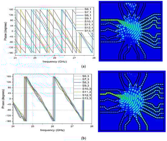 In the SICL, the design is sandwiched between two substrate layers which significantly improves the reflection coefficients (at some frequencies up to 15 dB) at the input ports. The simulated insertion losses of the designed RL are compared in Figure 5. Using the SICL, the insertion losses are improved by up to 5 dB as compared with the design of the MSL RL, which means a good transmission of EM energy from the input beam ports to the output array ports. A progressive phase shift is achieved at the output array ports when input beam ports are excited sequentially as can be seen in Figure 6. It can be seen that due to the phase alignment of the transmission lines connecting the connectors to the RL structure, the designed SICL RL shows a phase-aligned distribution across the output array ports.